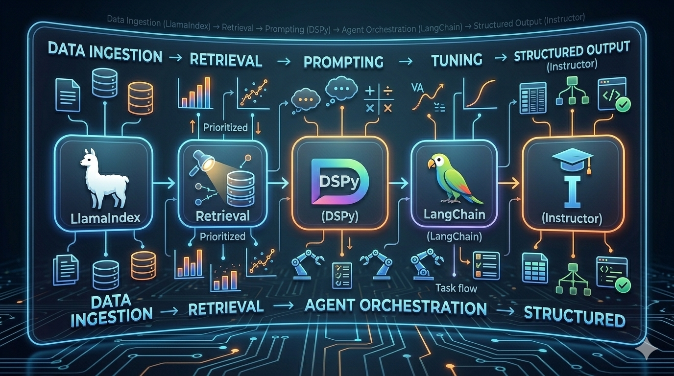- Generative AI & Orchestration: LangChain, LlamaIndex, DSPy